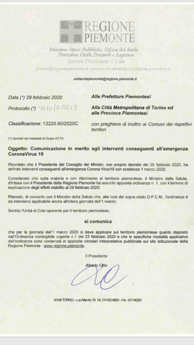 Il Presidente della Regione Piemonte ha comunicato che l'ordinanza n.1 è da intendersi applicabile anche per l'intera giornata del 1 marzo. Le modalità applicative rimangono quelle espresse nelle circolari interpretative pubblicate nei giorni scorsi sul sito istituzionale della Regione Piemonte.