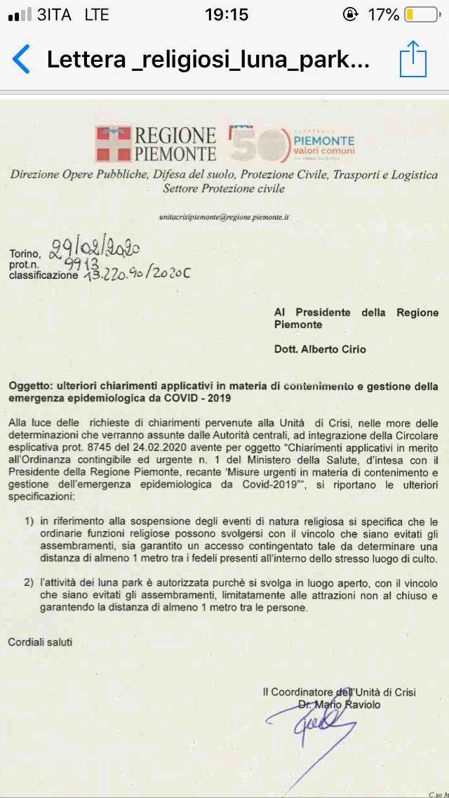 Inoltre il Coordinatore dell'Unità di Crisi della Regione ha relazionato per specificare ulteriormente i chiarimenti applicativi in merito alla stessa ordinanza per i luna park e le funzioni religiose.