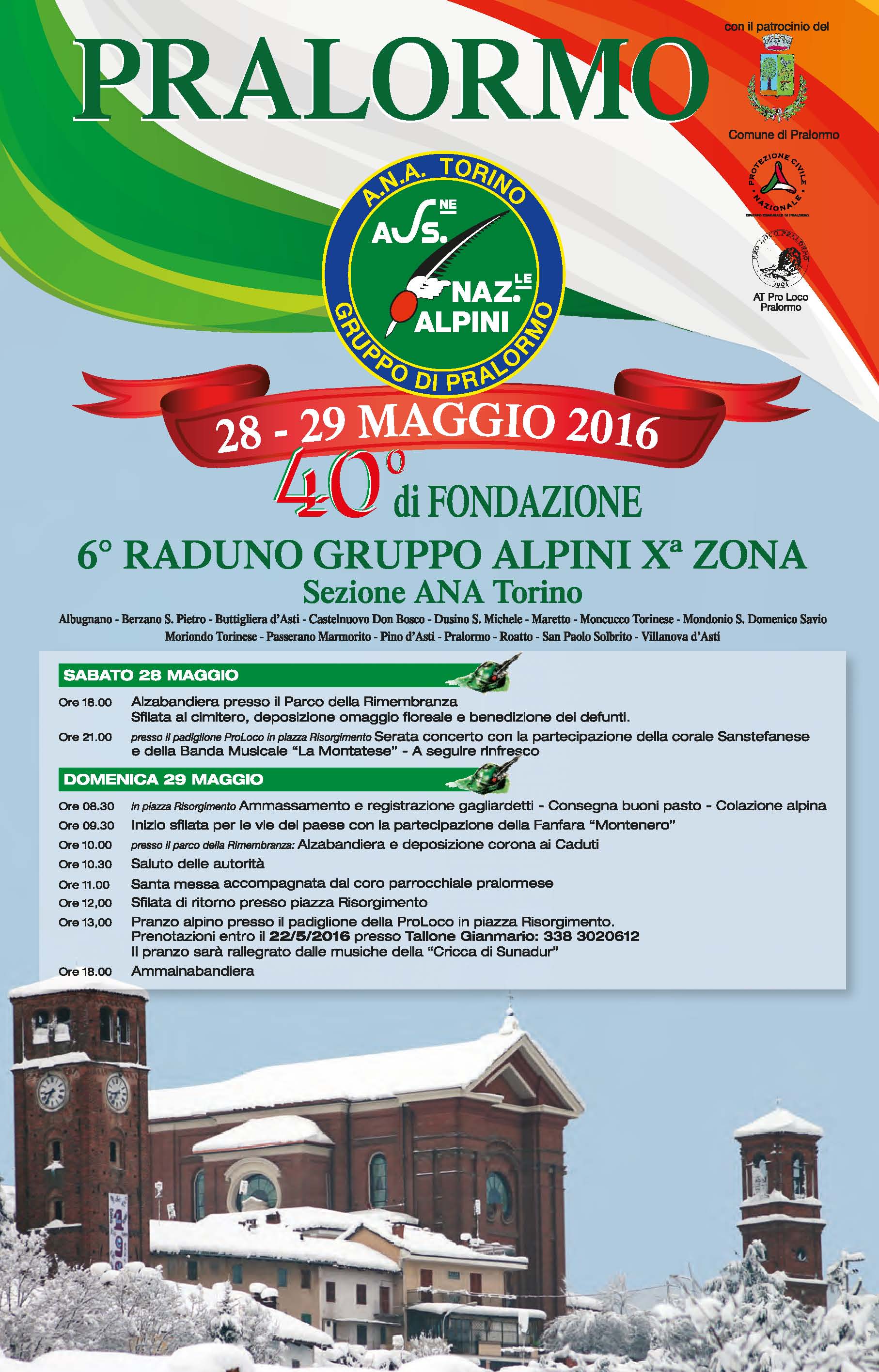 In occasione del 40° anniversario di fondazione del Gruppo di Pralormo, il 28 e 29 maggio si svolgerà il 6° Raduno Gruppo Alpini X Zona, di cui fanno parte i Comuni di Albugnano, Berzano di San Pietro, Buttigliera d'Asti, Castenuovo don Bosco, Dusino San Michele, Maretto, Moncucco Torinese, Moriondo Torinese, Passerano Marmorito, Pino d'Asti, Roatto, San Paolo Solbrito, Villanova d'Asti.