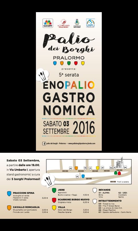 Sabato 3 Settembre: la Serata EnoPalioGastronomica con le specialità preparate dai 5 Borghi (scopri la posizione dei 5 borghi e dei gruppi musicali cliccando sulla foto). Tante prelibatezze ma non solo...